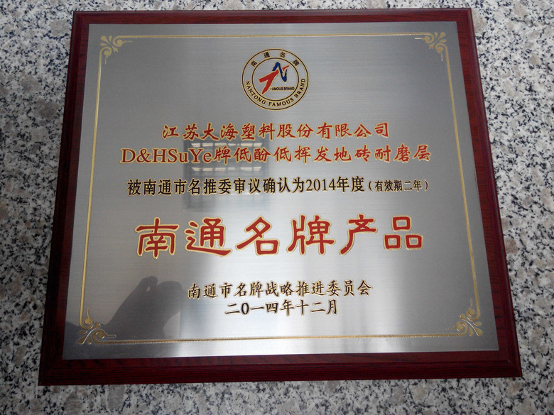 4月初,我公司去年申報的“D&H Su Ye牌低酚低揮發(fā)地磚耐磨層”獲評南通名牌(見下圖)。這是繼2013年“D&H Su Ye牌軟聚氯乙烯壓延薄膜”獲得南通名牌后,我公司得到的第二個南通名牌。